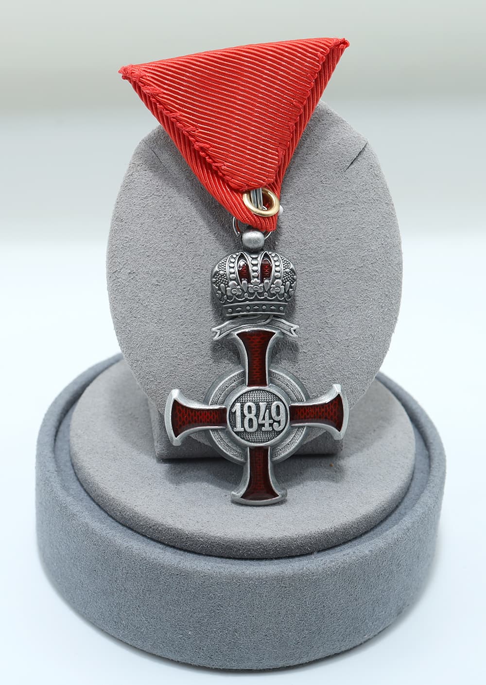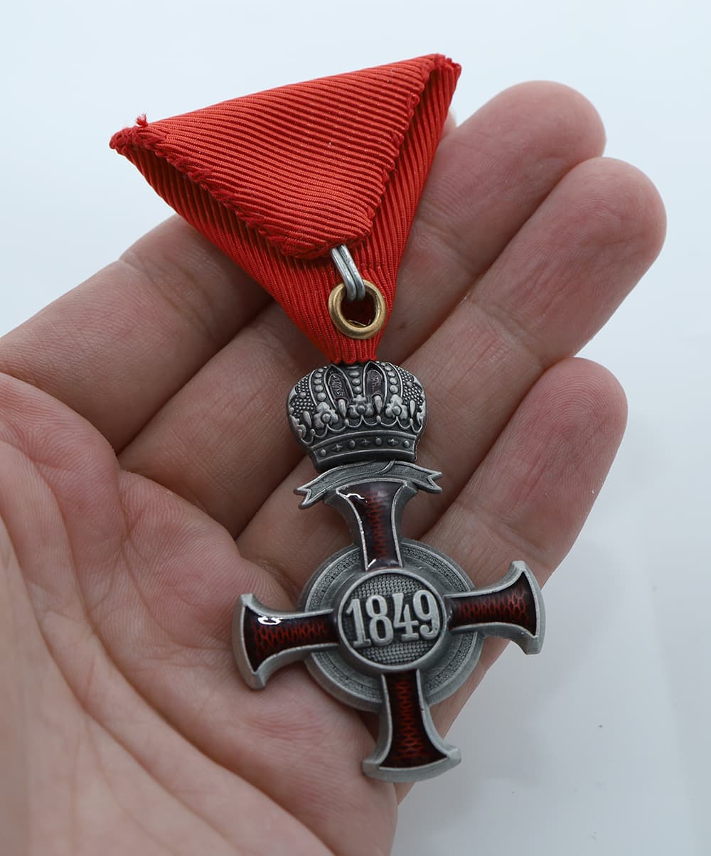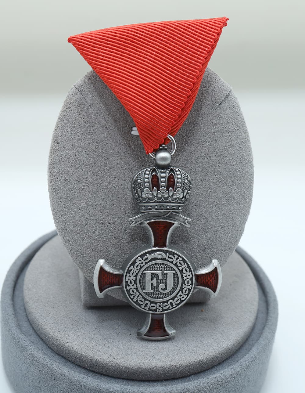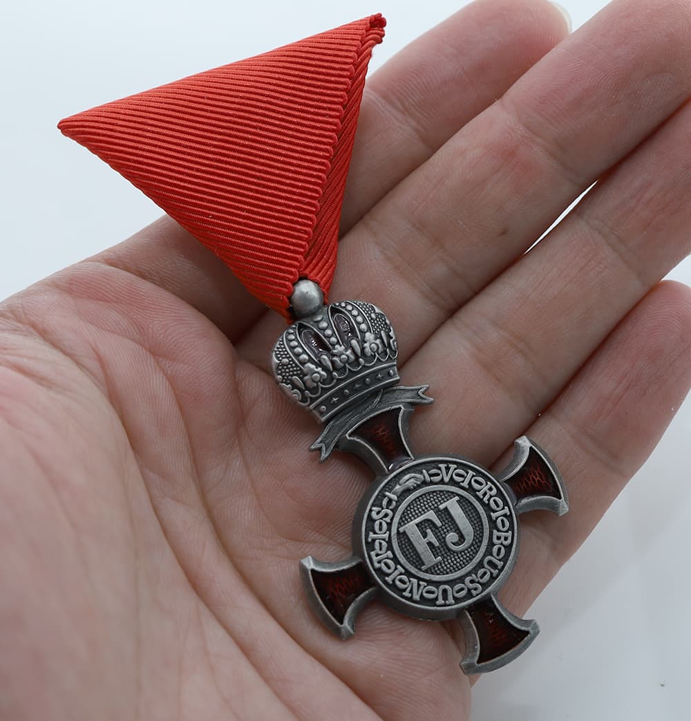 Silver Cross of Merit on the Red Ribbon with the Crown (Austria-Hungary) replica,featuring sharp details.