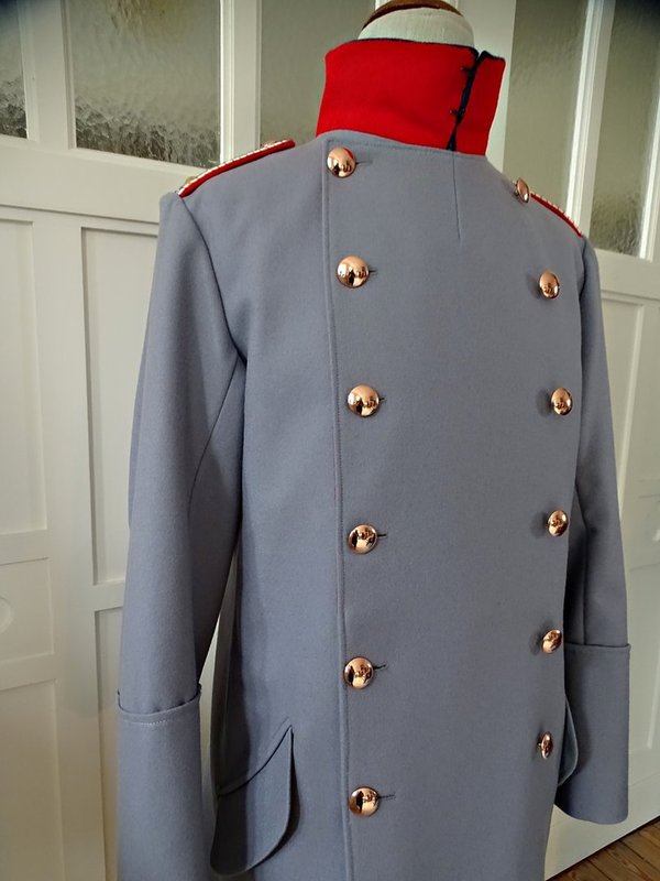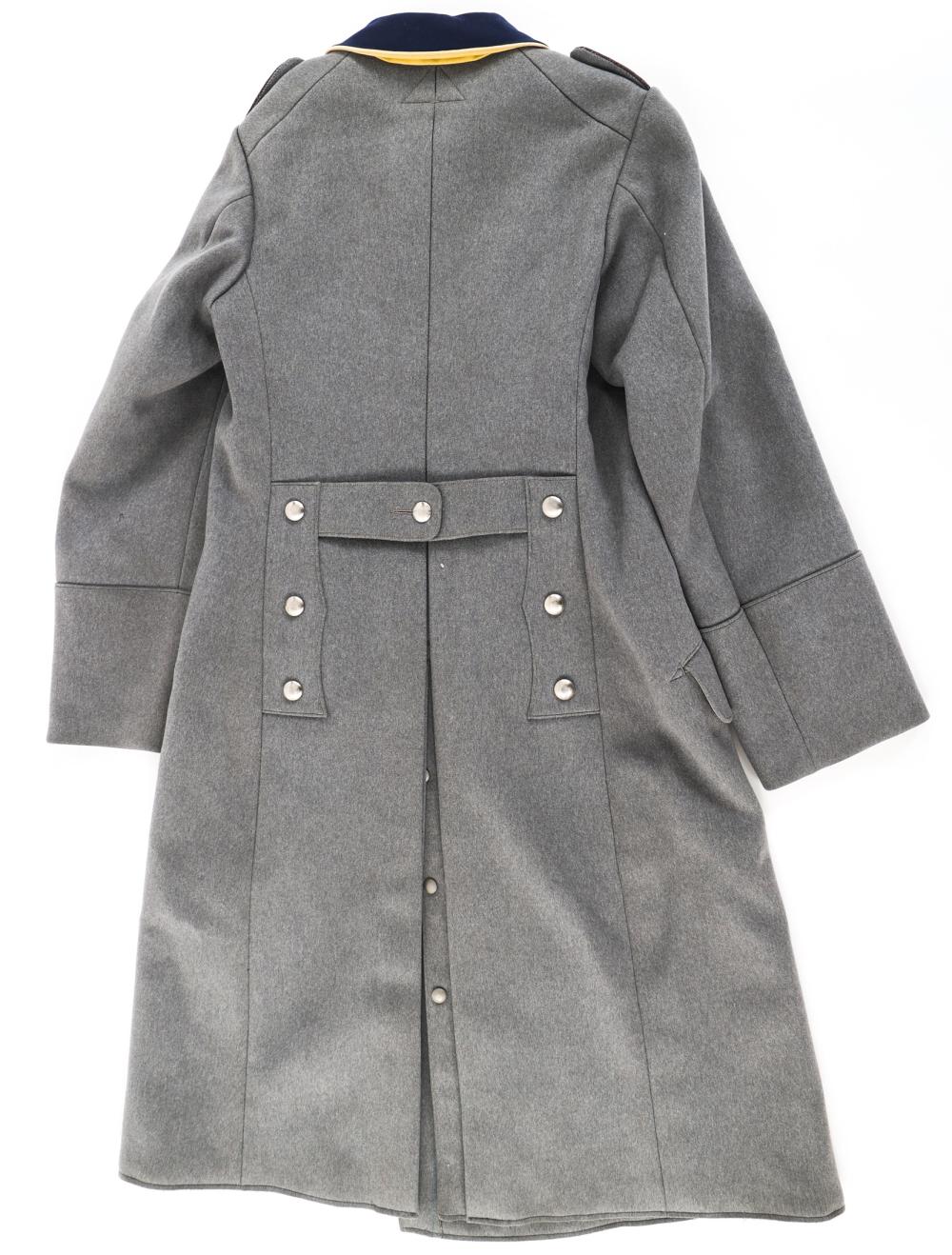 Made from SS generals gray wool(piping).Prussian blue wool around collar.Generals red wool underneath collar and lapel.Collar spreads wider than WW2 officers coat.3 Hooks on collar.Hook for belt on waist.No Insignia.25mm plain gold button